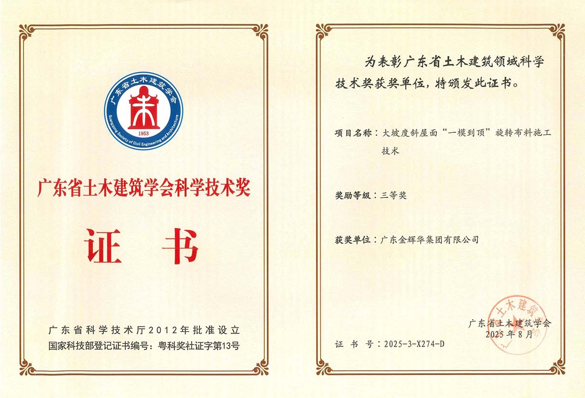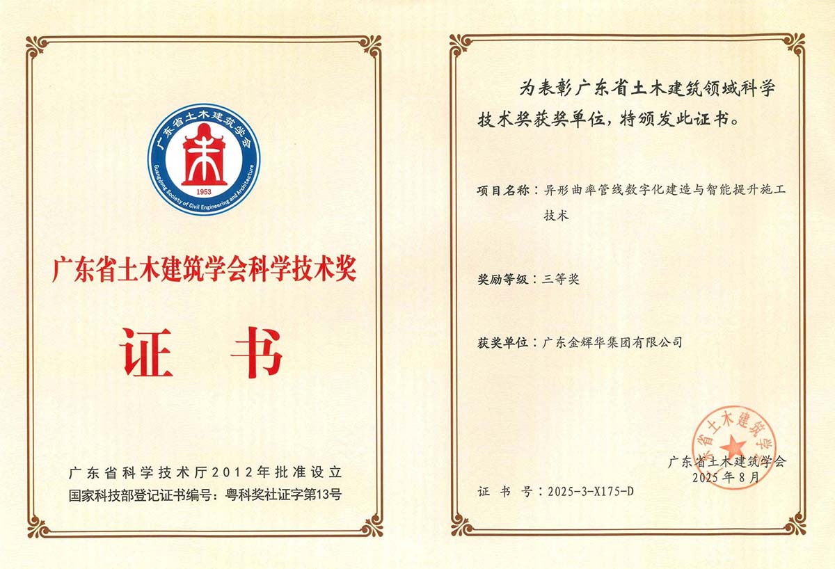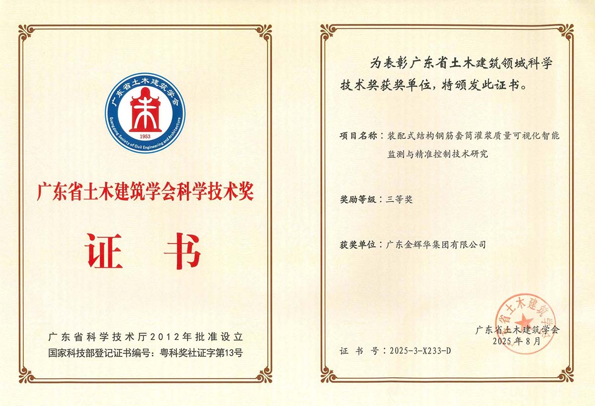 此次多項成果榮獲行業重要獎項,是對我們過去科技創新工作的肯定,更是激勵我們不斷前行的動力。未來,金輝華集團將繼續秉承科技引領、創新驅動的理念,緊盯行業前沿技術,不斷加強創新能力。我們將致力于打造更多具有核心競爭力的科技成果,為建筑行業的發展注入更多的金輝華智慧。